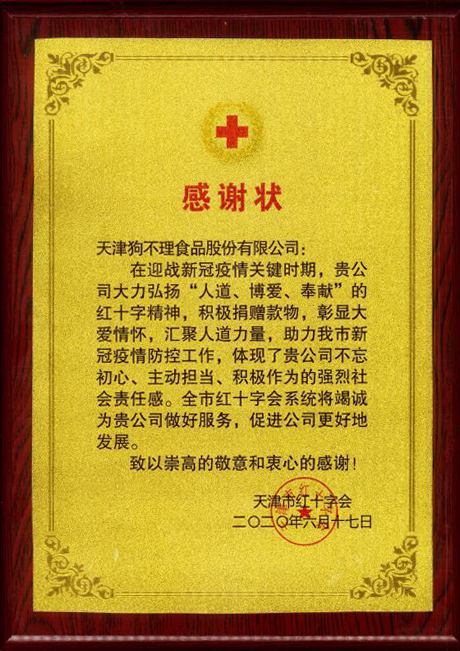 2020年1月,為支持新型冠狀病毒肺炎疫情防控工作,狗不理集團(tuán)及子公司通過天津紅十字會(huì)向天津市海河醫(yī)院、胸科醫(yī)院等醫(yī)療機(jī)構(gòu)對口捐贈(zèng)食品物資