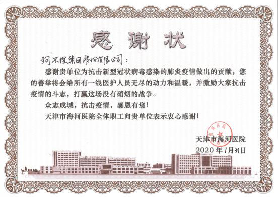 2020年2月,為防控新型冠狀病毒肺炎疫情,狗不理集團(tuán)及子公司從境外籌集防疫物資向天津市慈善協(xié)會(huì)捐贈(zèng)
